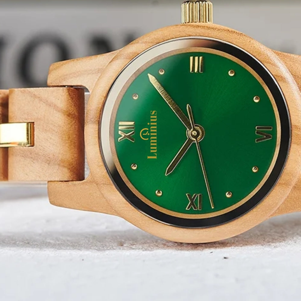 The Kakadu features a sustainably sourced olive wood case, showcasing rich, warm tones and unique grain. Its lush green dial, minimalist design, and gold-tone Roman numerals offer a refined, feminine touch.