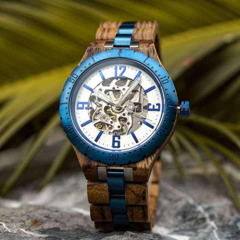 Using your body's natural motion (kinetic energy), the watch's rotor provides the power and energy to wind the mainspring and keep your wooden watch ticking all day. Not moving around too much? No problem, you can also wind the crown, as you would for any other mechanical watch.